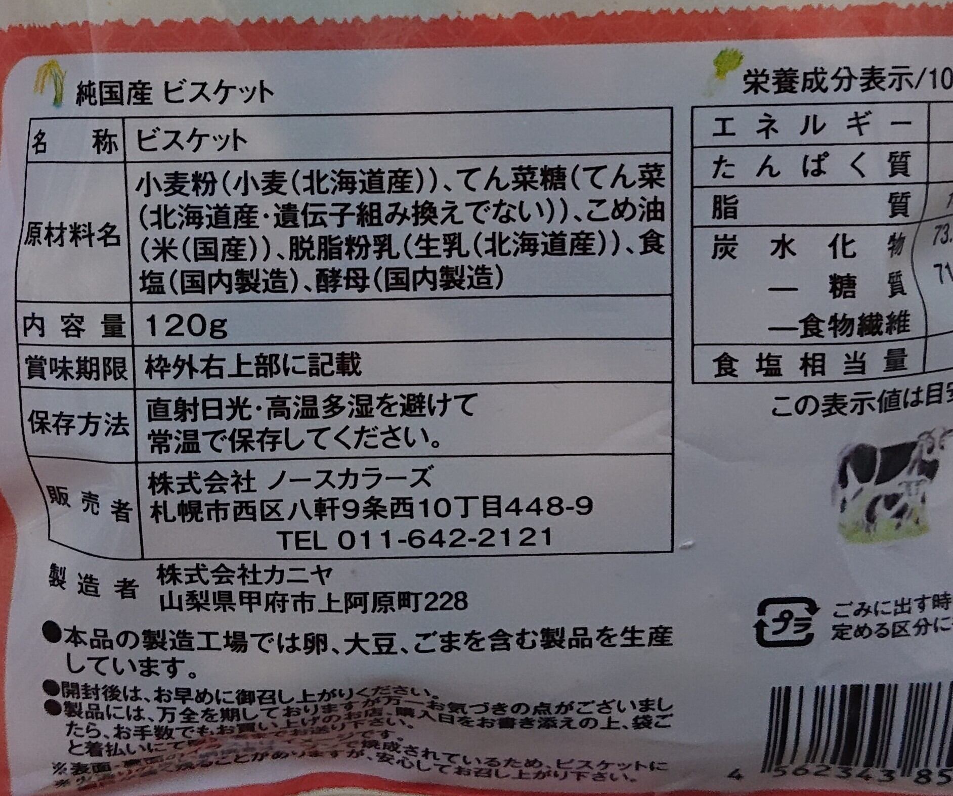 小麦粉(小麦(北海道産))、てんさい糖(てん菜(北海道産、遺伝子組み換えでない))、こめ油(米(国産))、脱脂粉乳(生乳(北海道産))、食塩(国内製造)、酵母(国内製造)