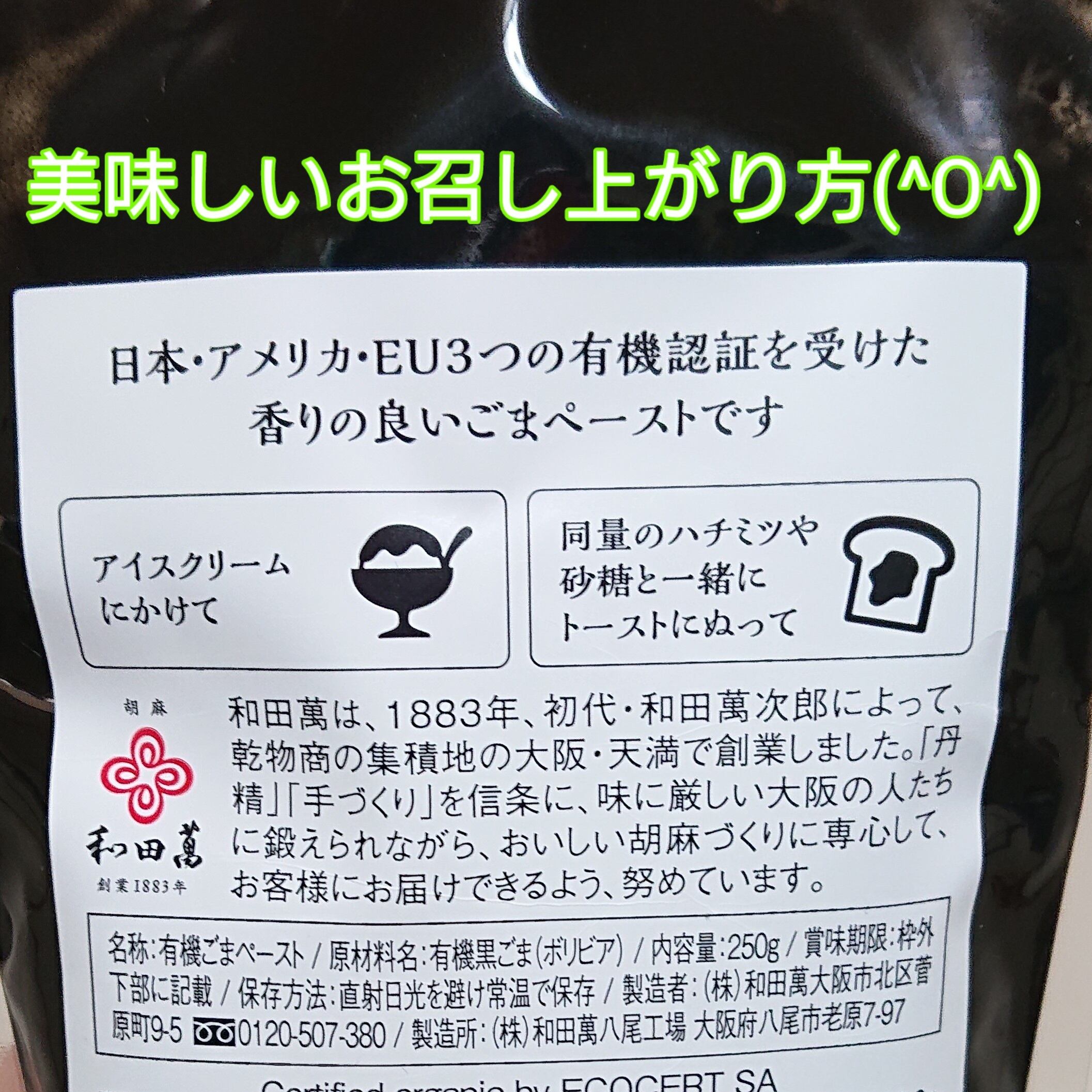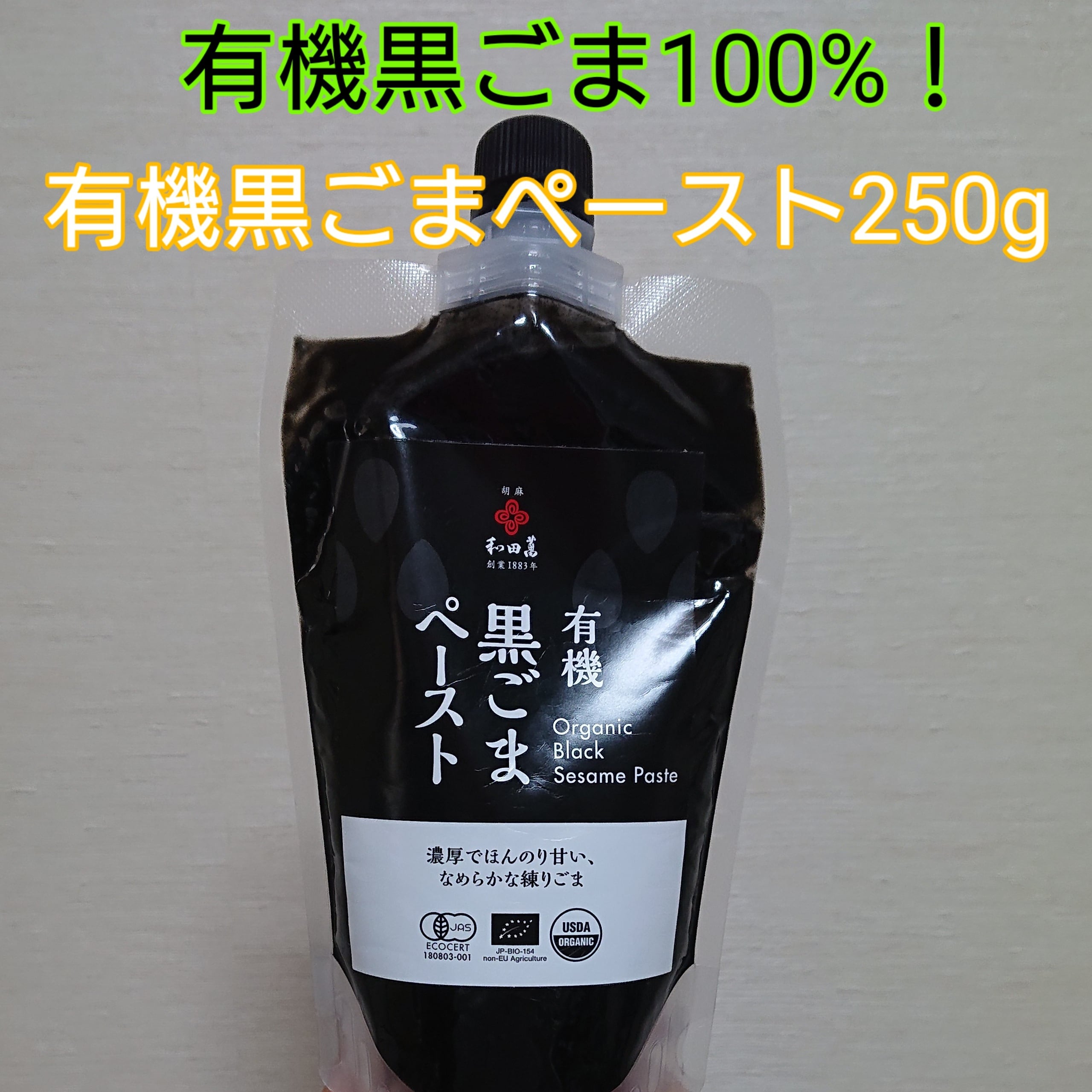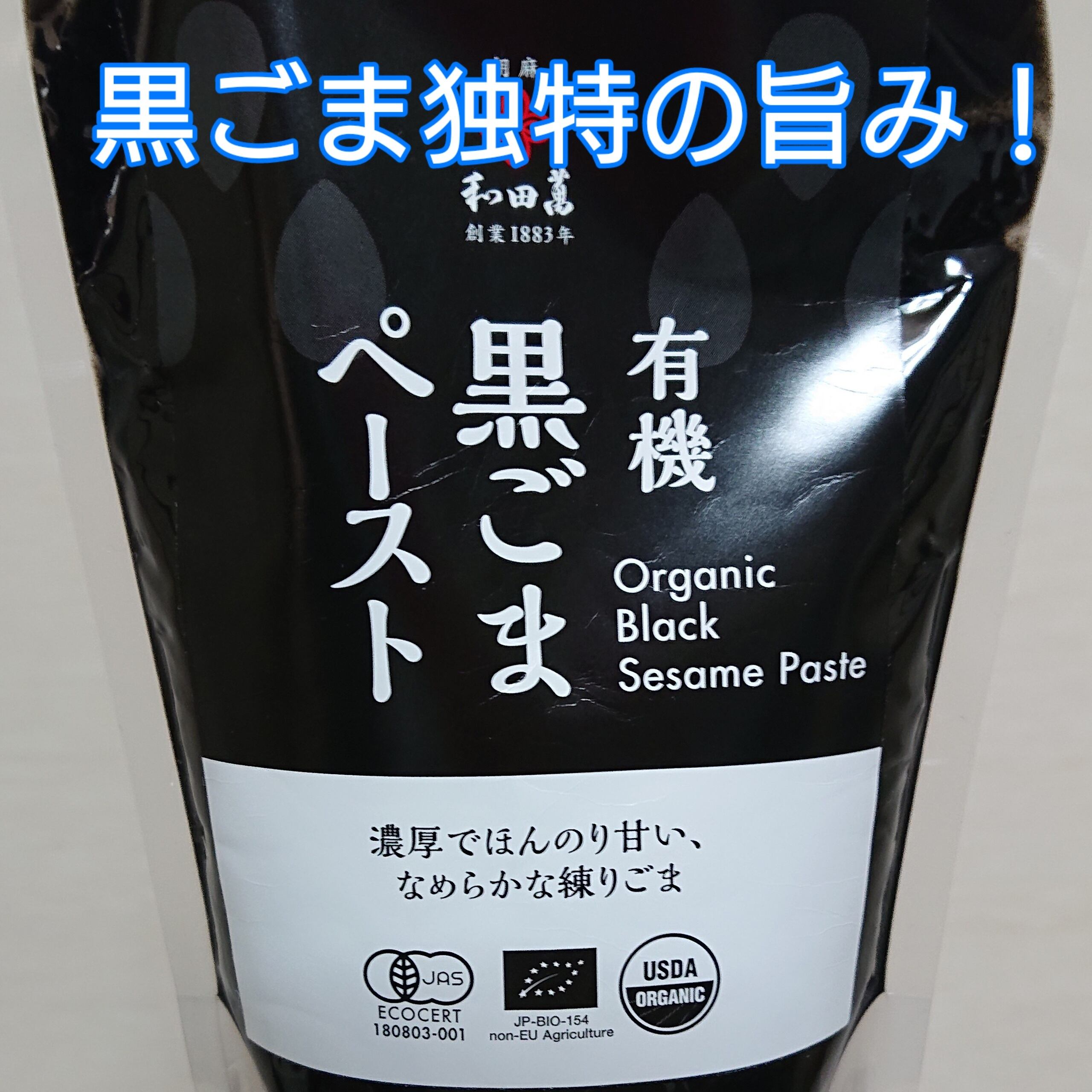 有機黒ごまを和田萬伝統の焙煎技法で超高温で焙煎したあと、特別な臼(うす)で何回も丁寧につぶしてペースト状に仕上げられています。なめらかな舌触り、黒ごま独特のうま味が特徴です(^-^)
