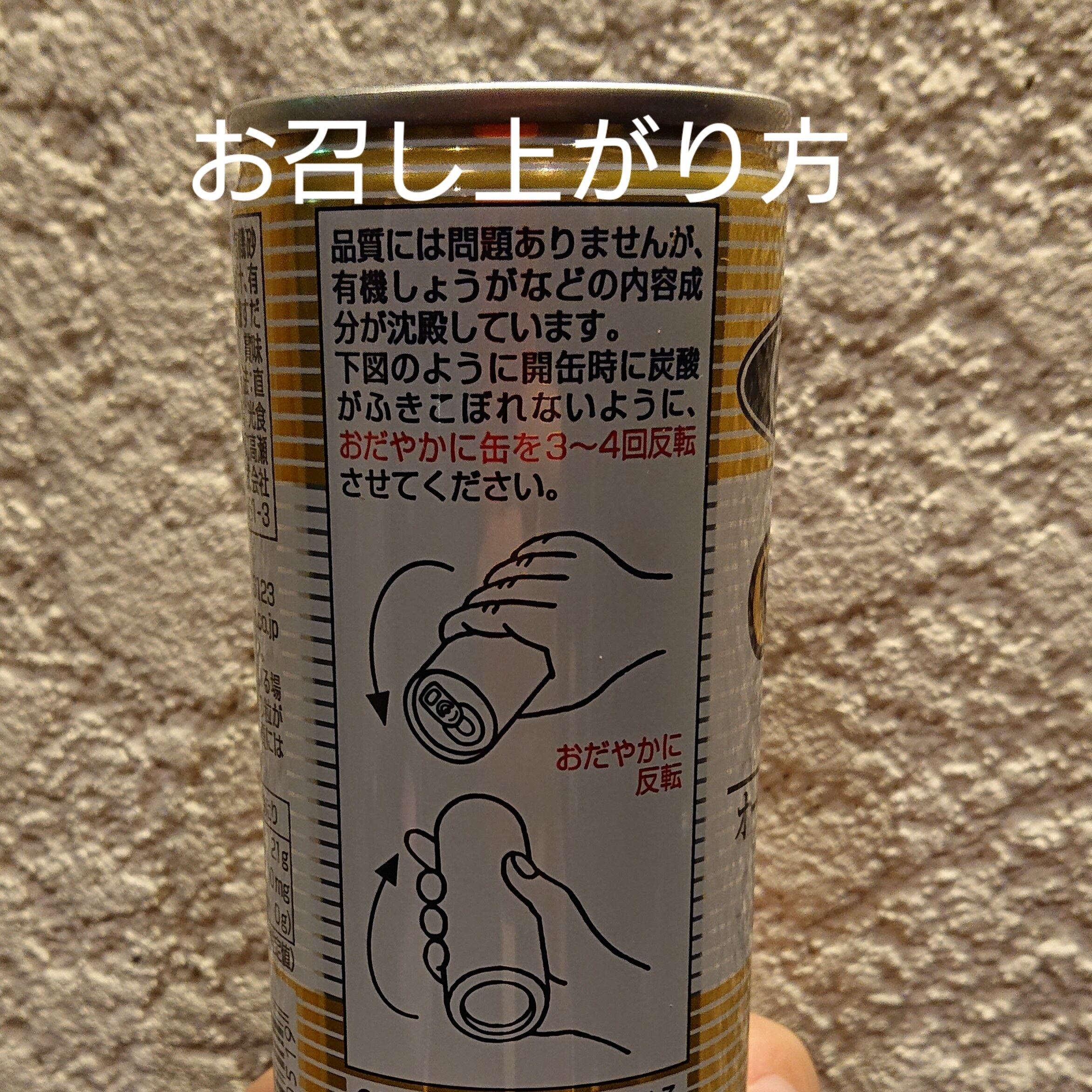※缶の中で有機しょうがが沈殿や凝集している場合があります。下図のように開缶前に炭酸が吹きこぼれないように穏やかに缶を3~4回反転させて下さい。